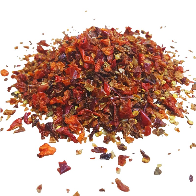 Паприка красная кусочки  -пряность из сладких  сортов стручкового перца  Это ароматные кусочки, ярко-красного цвета, которые обладают сладковатым вкусом с горчинкой.Паприка очень популярна в азиатской и европейской кухне. Она хорошо сочетается с мясом и птицей, ее добавляют в гуляш, к рыбе, морепродуктам, в овощные смеси и к супам. Паприка отлично сочетается с фасолью, томатами, капустой, картофелем.