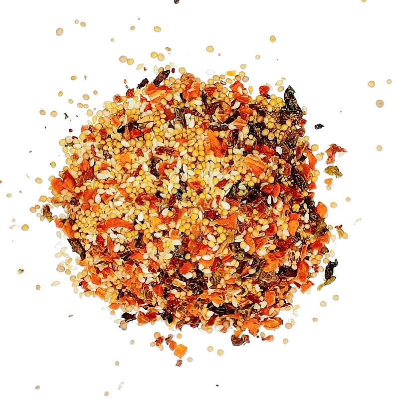 Декоративная смесь с кусочками паприки, морковью, горчичным семенем и кунжутом обладает ярким ароматом паприки и ярко выраженным вкусом моркови. Она прекрасно подойдет для украшения мясных деликатесов, рулетов, варено-копченых и сырокопченых колбас, полуфабрикатов, рыбных деликатесов и изделий из птицы. Придаст им превосходный внешний вид и подарит пикантный вкус и аромат.