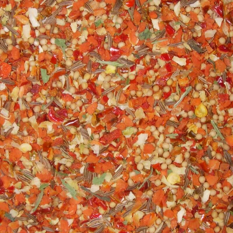 Пестрая декоративная смесь с кусочками паприки, тмином, морковью, горчичным семенем и сухой зеленью прекрасно подойдет для украшения мясных деликатесов, рулетов, варено-копченых и сырокопченых колбас, полуфабрикатов, рыбных деликатесов и изделий из птицы. Придаст им превосходный внешний вид и подарит пряный аромат.
